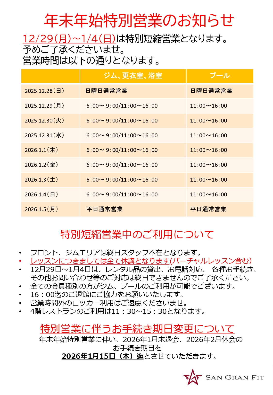 2025年11月14日 UP | その他 年末年始営業時間のお知らせ 日頃よりSAN GRAN FITをご利用いただき、誠にありがとうございます。 年末年始の営業時間につきまして、下記の通りご案内申し上げます。 営業時間をご確認の上、ご来館くださいますようお願い申し上げます。 【PDF版はこちら】 前のお知らせ 次のお知らせ NEWS 代行・休講のお知らせ